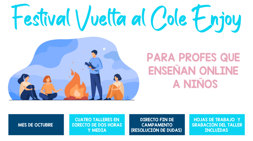 El Festival de Vuelta al Cole abre sus puertas a partir de la última semana de septiembre. Un campamento pensado por y para profes online que enseñan a niños. Aprovecha para dar un impulso a tu formación como profe online, ya estés empezando o lleves un tiempo trabajando en esta modalidad. Te llenarás de ideas que te ayudarán a ganar tiempo y motivación para el nuevo curso.